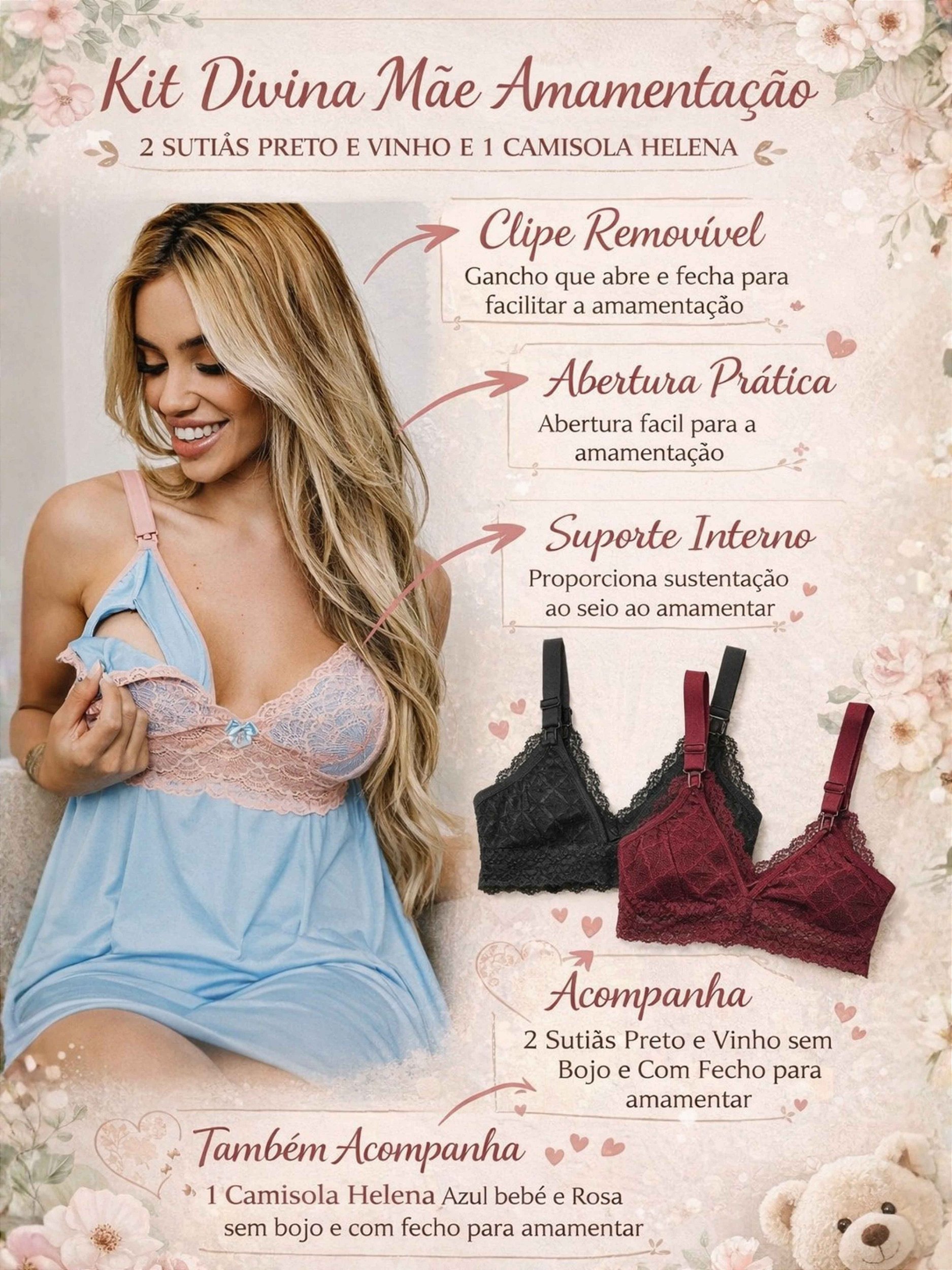 Os sutiãs contam com abertura prática para facilitar a amamentação, além de tecido macio e ajuste confortável ao corpo. A camisola Helena complementa o conjunto com um caimento leve e delicado, ideal para o descanso e para os momentos especiais com o bebê.