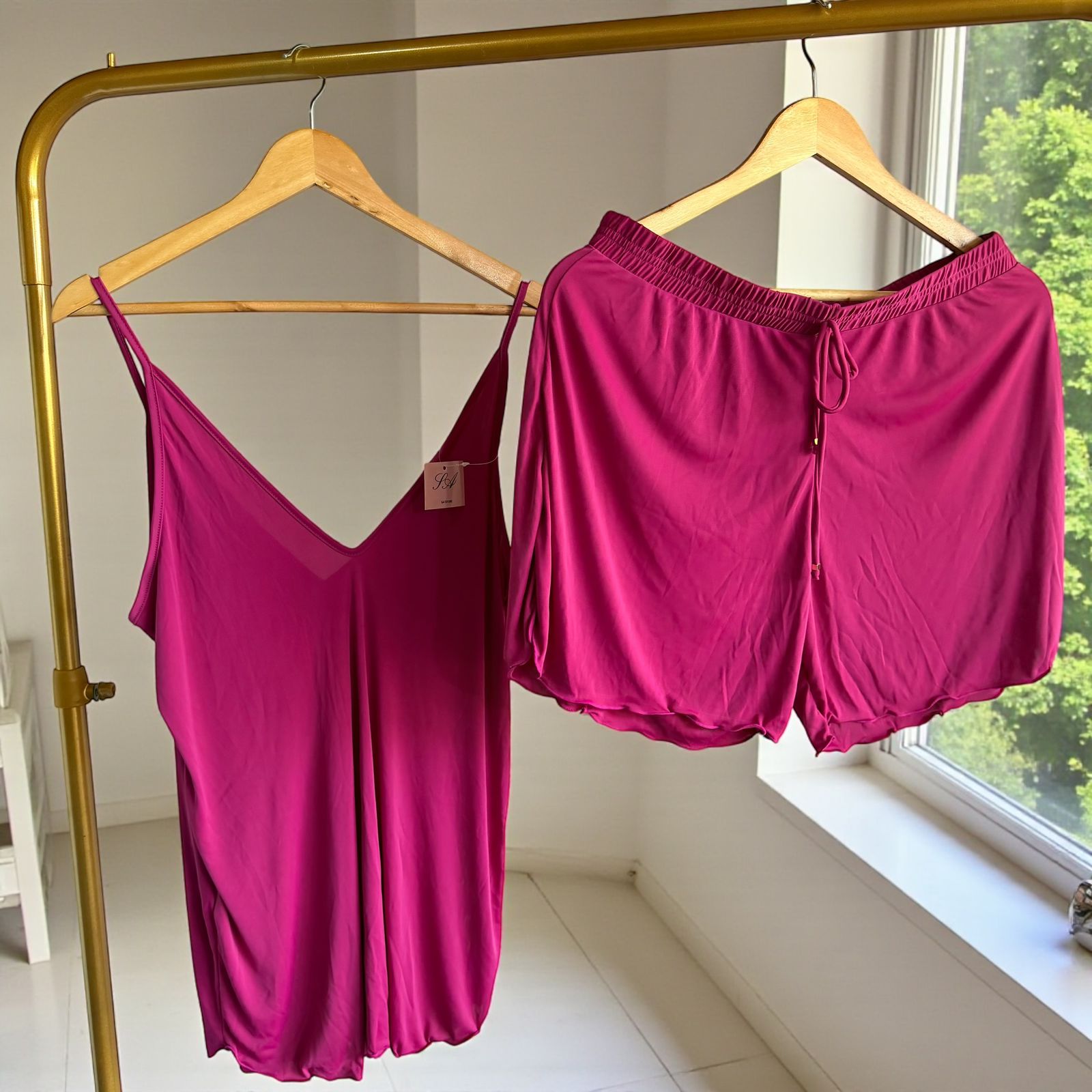 Um pijama fresquinho e soltinho que te proporciona conforto, ele é confeccionado em liganete 100% poliamida, aquele tecido leve e com toque 'gelado' ideal para as noites quentes.Blusa com decote em 'v' e alças finas, decote nas costas que trás feminilidade com detalhe de plaquinha personalizado. O Short possui falso amarrador roliço e ponteiras.