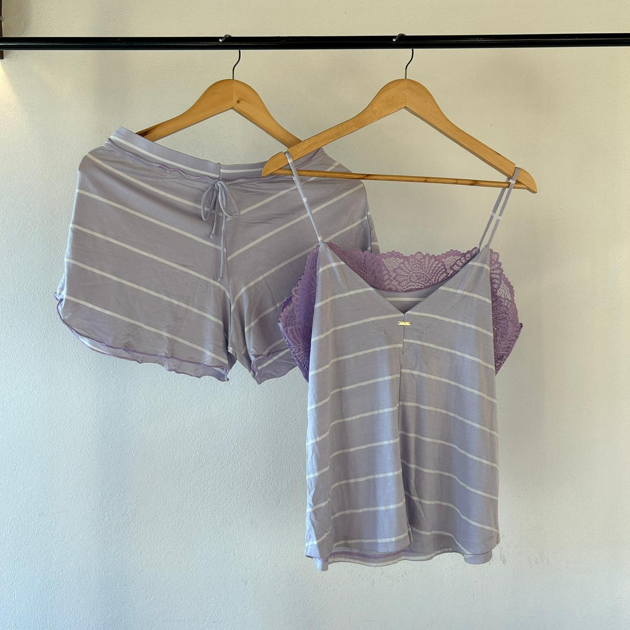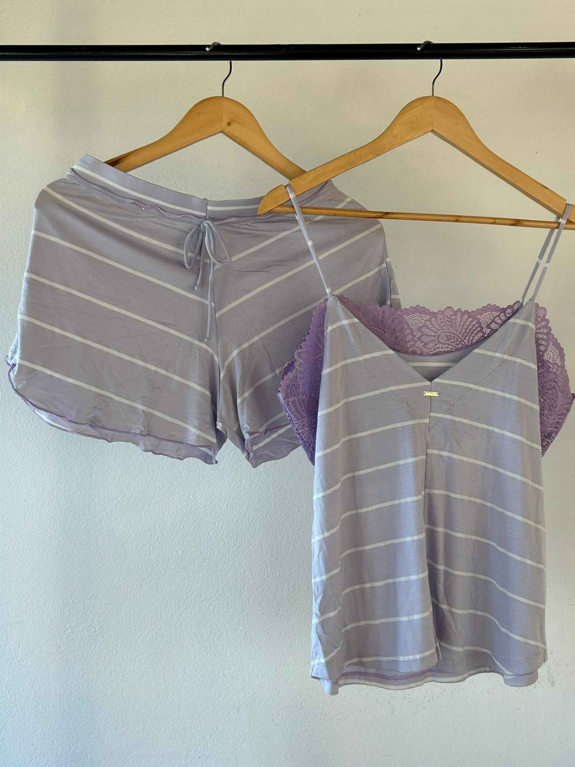 Um pijama delicado e romântico inteiro confeccionado em viscolycra listrada, blusa com detalhes de renda na frente e laterais e decote em 'v' nas costas que deixa a peça com mais feminilidade e detalhe de plaquinha personalizada. O short tem acabamento na barra e cós em frufru e falso amarrador roliço com ponterias.