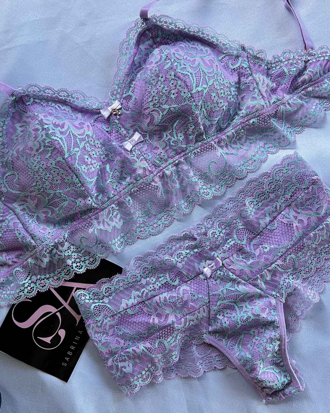Este conjunto de lingerie é composto por um top cropped de renda e uma calcinha combinando, ambos na cor lílas, que transmite romantismo e elegância. O top apresenta alças finas ajustáveis, um detalhe delicado de laço no centro e uma renda floral que se estende até abaixo do busto, criando um acabamento sofisticado. A calcinha é igualmente rendada, com cortes estratégicos que valorizam o corpo e um pequeno laço na frente para um toque de charme. Ideal para ocasiões especiais ou para quem quer se sentir confiante e confortável no dia a dia.