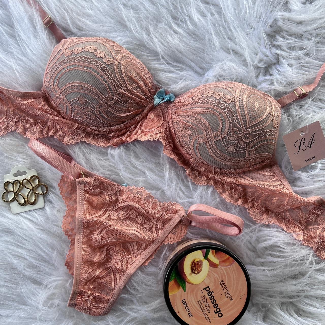 Qual material que o Conjunto é confeccionado: O Conjunto é confeccionado em Renda: 90% poliamida e 10% elastano; Bojo: 60% poliuretano e 40% poliéster e forro 100% algodão.
