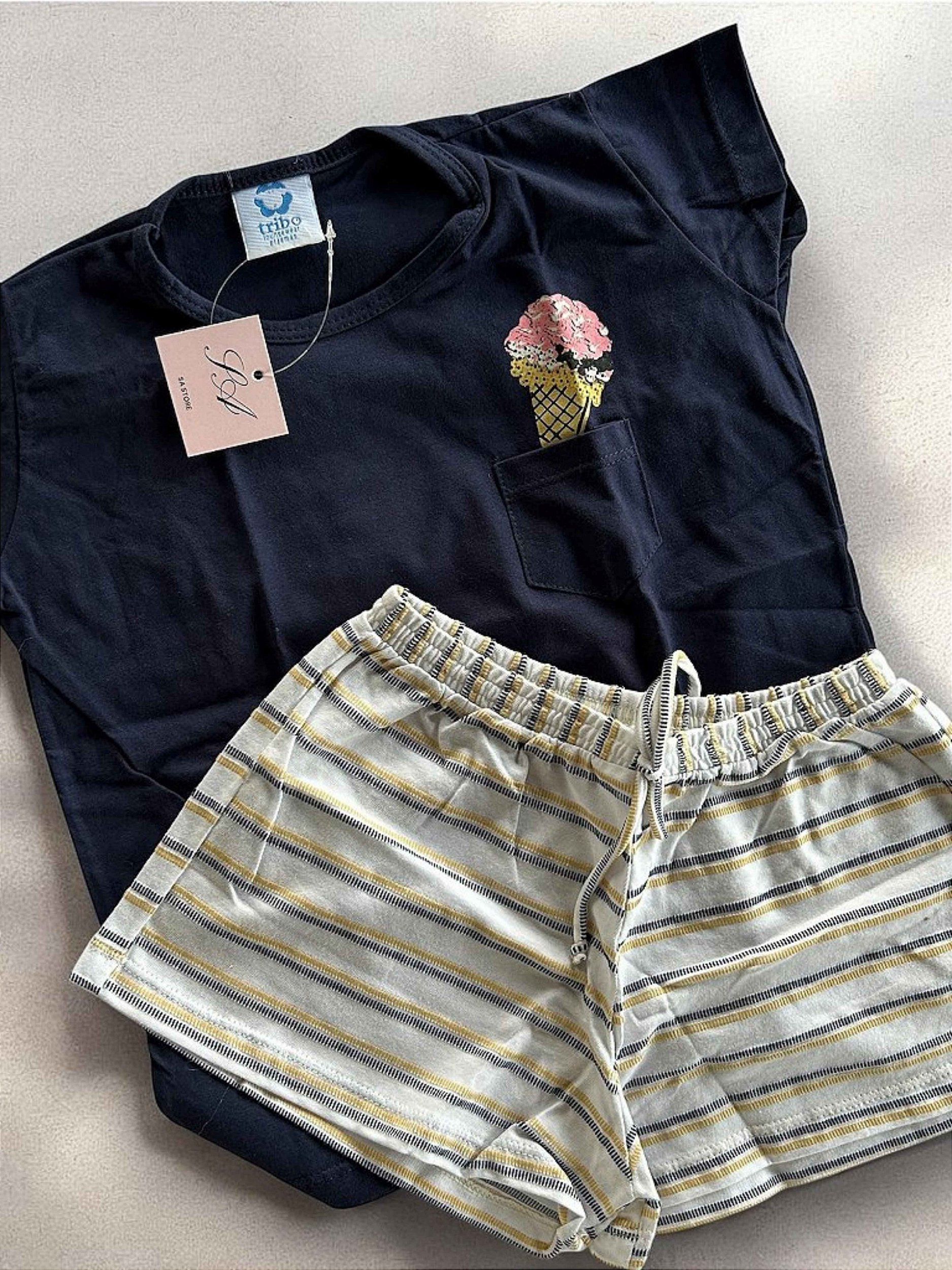 Pijama infantil fofo, lindo e muito confortável, seu tecido e bem Fresquinho e macio deixando a peça mais aconchegante, sua pequena vai amar. O Pijaminha é para os dias de calor ele tem o modelo de camiseta com bolso e seu shortinho te elástico é todo listrado além de ser um item indispensavel e essencial no guarda-roupa infantil.