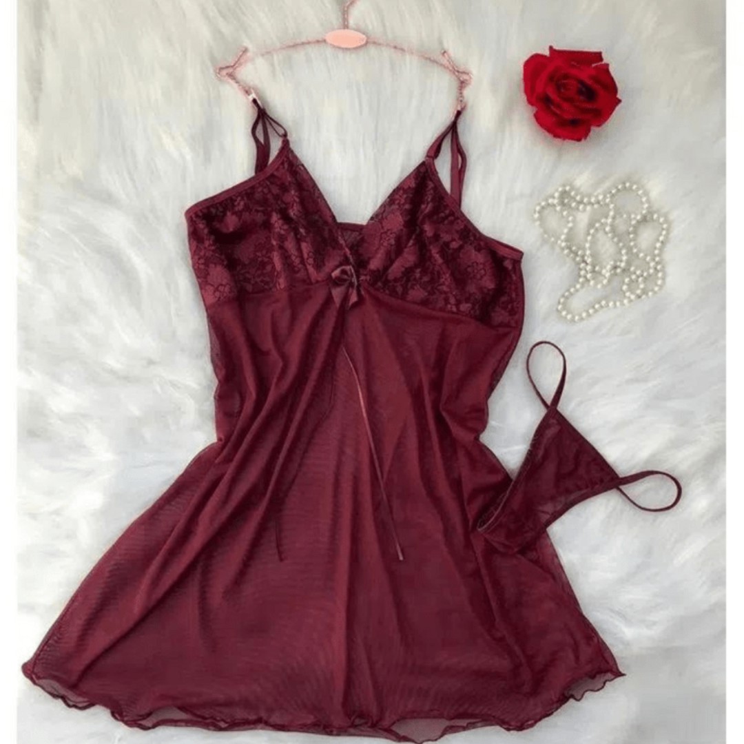 A camisola Mariana é Toda confeccionado em tule, transparência não falta para acelerar o coração de seu parceiro e deixá-lo daquele jeito. Ela possui detalhes em renda na região dos seios, que dá um toque de elegância com um mix de delicadeza, seu decote é em V com um lacinho entre os seios. Ela acompanha uma calcinha também em tule transparente, para o crush não ter dúvidas dos seus desejos para aquela noite.